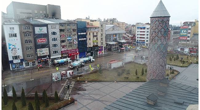 Erzurum Büyükşehir Belediyesi ekiplerinin dezenfekte çalışmaları drone ile görüntülendi.