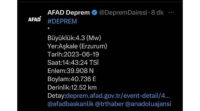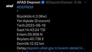 AFAD'ın verilerine göre saat 14.43 'de meydana gelen 4,3 büyüklüğündeki deprem 12,52 kilometre derinlikte gerçekleşti. Depremler Erzurum merkezde de hissedildi. Alınan ilk bilgilere göre meydana gelen depremde herhangi bir hasar ya da can kaybı yaşanmadı. Bu arada bu gün yine Aşkale'de saat 14:13'de 2,0 ve 14.20'de 3,2 büyüklüğünde depremler meydana geldi.