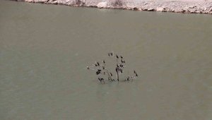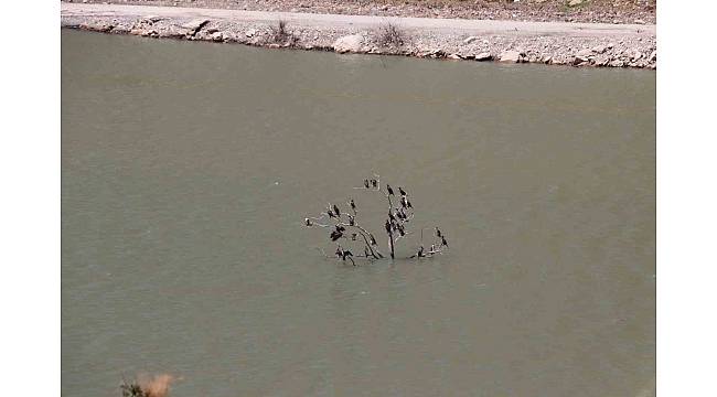 Su debisi düşen Oltu'nun Ayvalı Barajı'ndan ortaya çıkan kurumuş ağaç, karabatak kuşlarına adeta sığınak oldu.