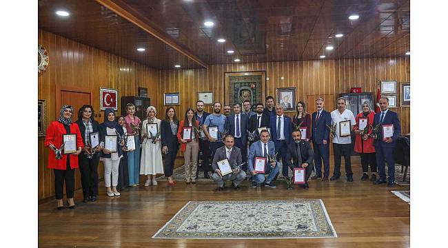 Öğretim elemanlarıyla Rektörlük makamında bir araya gelen Prof. Dr. Ömer Çomaklı'ya rektör yardımcıları da eşlik ederken, Yeni Nesil Üniversite çalışmaları çerçevesinde eğitim, araştırma ve topluma katkı misyon alanlarını harmanlayan eğitim, araştırma, topluma katkı, araştırma temelli eğitim, eğitim temelli toplumsal katkı, araştırma temelli toplumsal katkı ve çarpan katkı alanlarında verilen ödüller sahiplerini buldu.