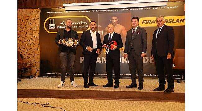 Fırat Arslan, konuşmalardan sonra altın kemeriyle poz verdi ve Büyükşehir Belediye Başkanı Mehmet Sekmen'e imzalı boks eldiveni hediye etti.