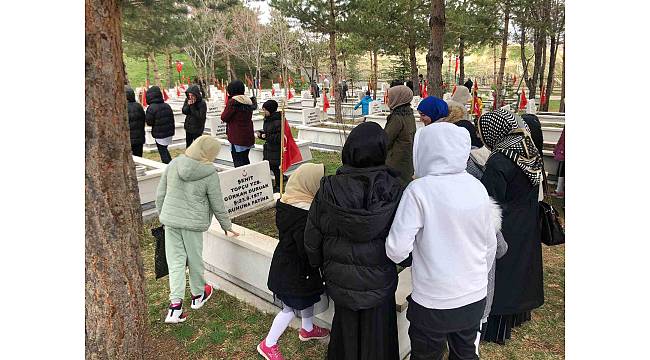 Programda okunan hatimlerin duası yapıldıktan sonra şehit mezarlarını gezen çocuklar, oradaki şehit aileleriyle beraber şehitlerin mezarları başında dua okudu.